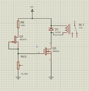 Prinsip kerja : Ketika tidak ada tegangan yang diberikan, dioda dan transistor dalam keadaan off. Arus tidak mengalir melalui rangkaian. Saat tegangan positif (+6V) diberikan, dioda menjadi bias maju dan memungkinkan arus mengalir dari kutub positif sumber tegangan ke katoda dioda. Transistor juga menjadi bias maju karena basisnya terhubung ke katoda dioda D1 yang memiliki potensial positif. Arus mengalir dari kolektor transistor ke emitornya, dan kemudian ke beban relay. Ketika tegangan negatif (- diberikan, dioda menjadi bias mundur dan tidak memungkinkan arus mengalir. Transistor juga menjadi bias mundur karena basisnya terhubung ke katoda dioda yang memiliki potensial negatif. Arus tidak mengalir melalui rangkaian, sehingga beban relay tidak mendapatkan tegangan.